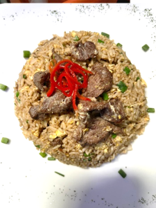 125gr de lomo fino al wok con huevo, arroz, salsa de la casa, cebolla china con un sabor oriental.