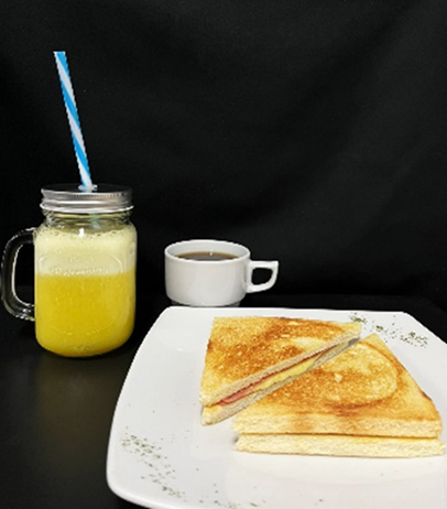 2 capas de pan blanco grillados con mantequilla, relleno con queso Edam y Jamón acompañado de café americano y jugo de f...