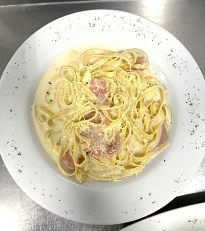 fetuccini servido con salsa bechamel, crema de leche, jamón y queso parmesano.