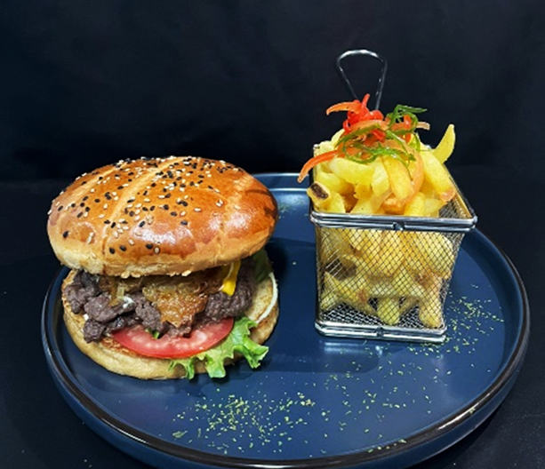120gr de carne, cocida en la plancha acompañado de cebolla caramelizada, tomate, lechuga, queso cheddar y papas fritas.