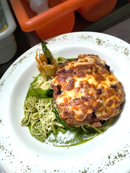 MILANESA NAPOLITANA CON SPAGUETTI AL PESTO