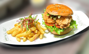 pan hamburguesa con 150gr de pollo broaster, acompañado de tomate, lechuga, pickles y papas fritas.