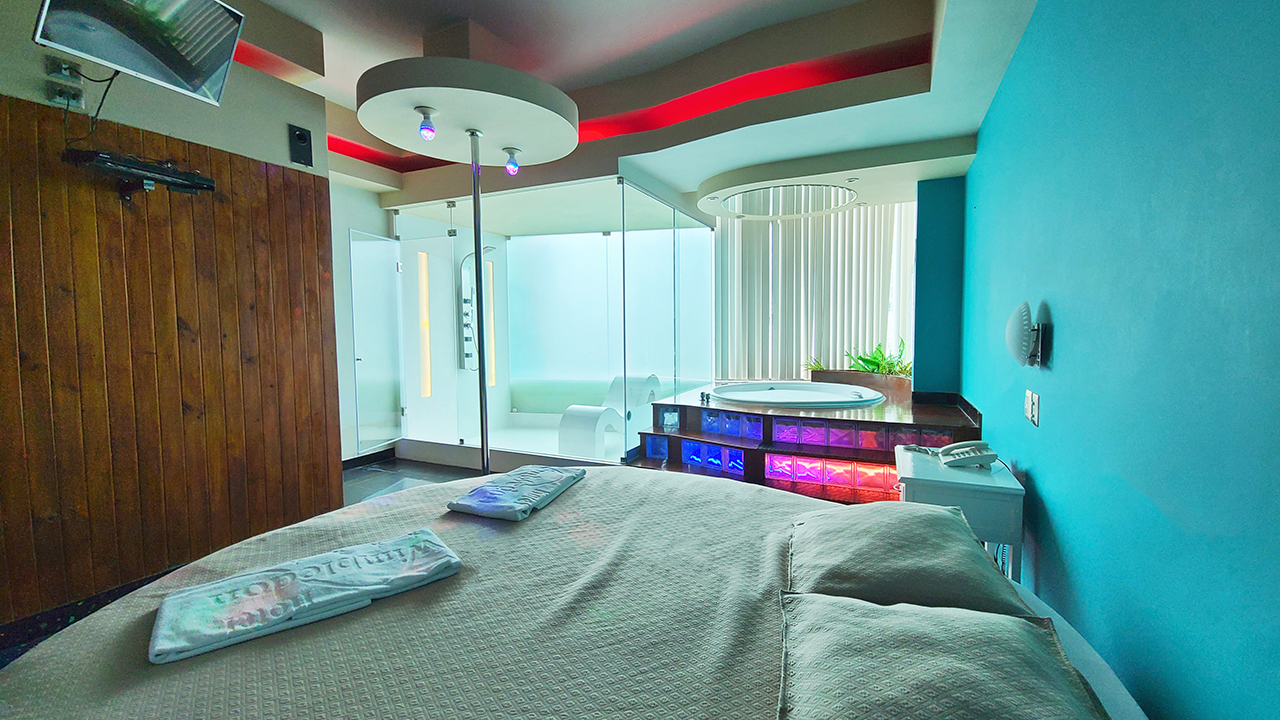 Detalles: Cama redonda, Sillón Tántrico de Cuarzo, Cámara Seca, Ducha española, Jacuzzi con Hidromasaje, Pole Dance, Baño privado y Frigo bar (con cargo extra).